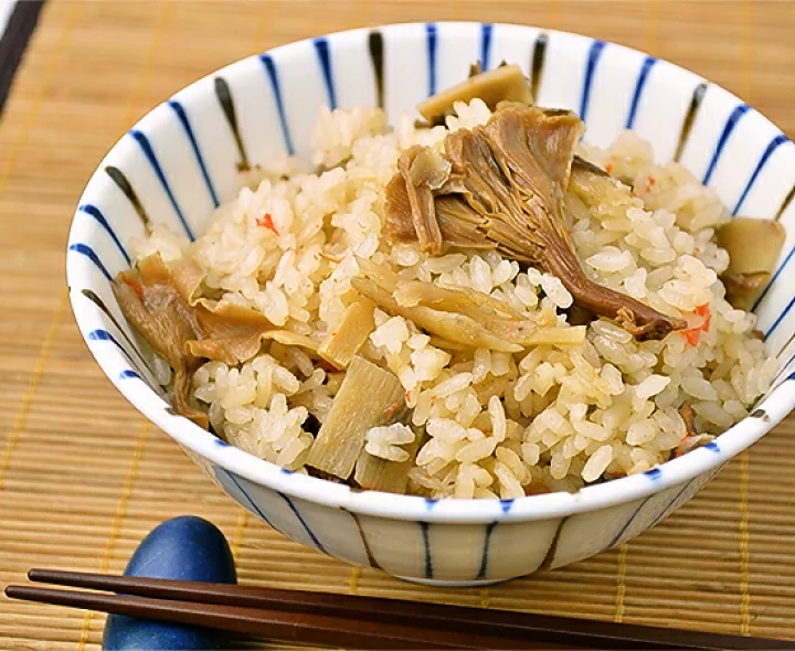 米と一緒にタモギ茸を加え、出汁や醤油で味付けして炊き上げます。